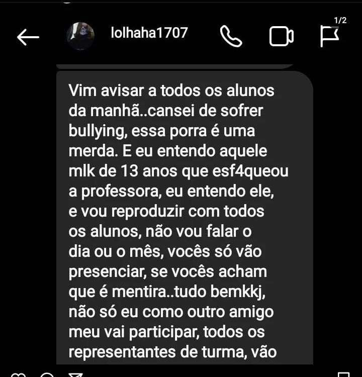 Pais voltaram à escola para buscar seus filhos depois da repercussão nas redes sociais sobre um possível ataque que seria realizado hoje. “Vim avisar a todos os alunos da manhã.. cansei de sofrer bullying, essa porr* é uma merda. E eu entendo aquele mlk de 13 anos que esf4aqueou a professora, eu entendo ele, e vou reproduzir com todos os alunos”, diz uma das mensagens compartilhadas.