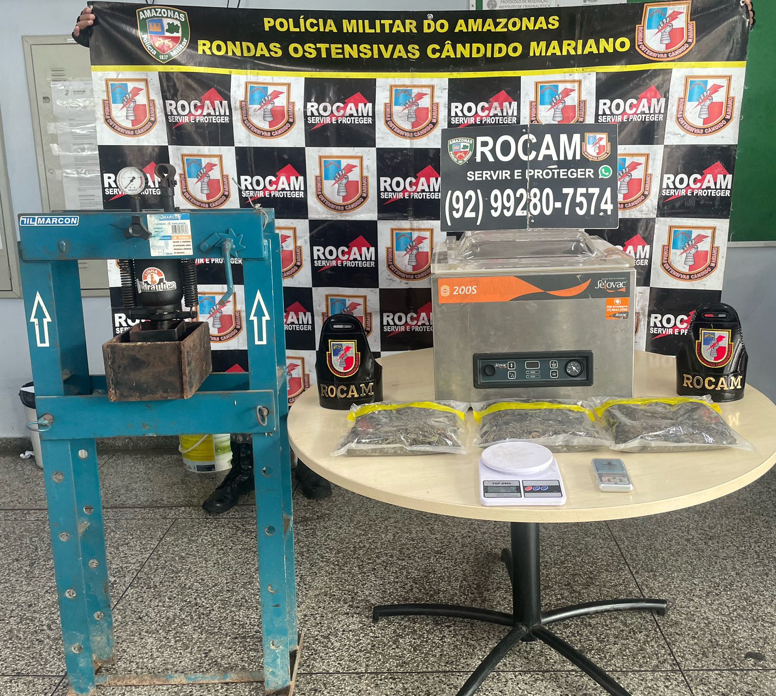 A Polícia Militar do Amazonas (PMAM), por meio das Rondas Ostensivas Cândido Mariano (Rocam), apreendeu uma máquina de embalar drogas, três pacotes de maconha do tipo skunk e outros materiais utilizados no preparo de entorpecentes, na tarde de sexta-feira (05/09), no bairro Tarumã, zona oeste de Manaus.